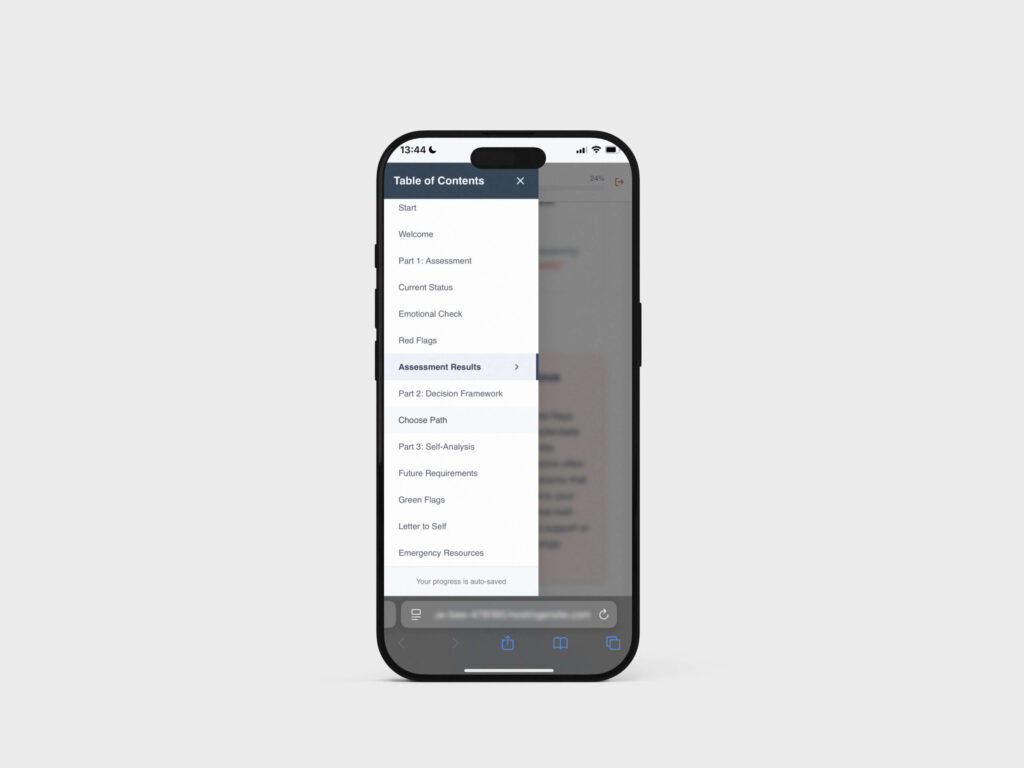 Where are you right now? What brought you here? The red flag assessment (identify patterns without judgment). The decision framework (three exercises to help you choose your path).
