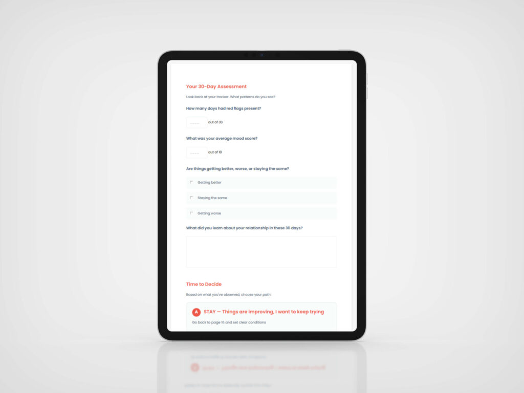 This is a self-guided workbook, not therapy. It’s based on research about relationship health, red flags, and decision-making frameworks. If you’re in crisis or dealing with trauma, please also seek professional support.